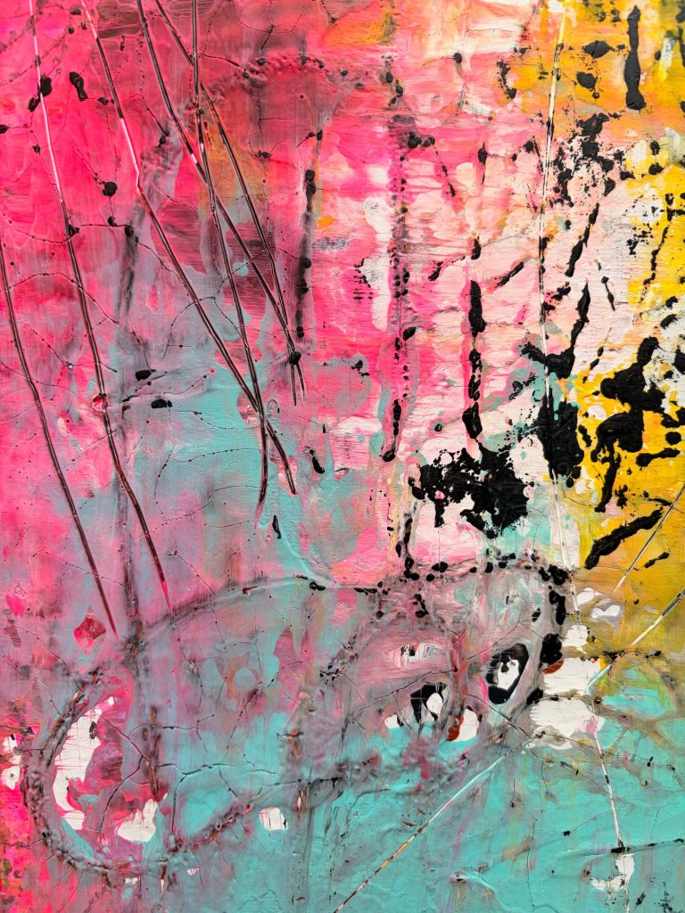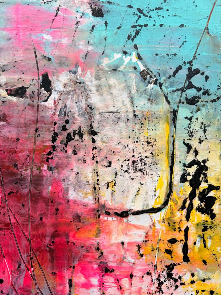 Dieses abstrakte Acrylgemälde lebt von intensiven Farbkontrasten und einer vielschichtigen, lebendigen Oberfläche. Leuchtendes Pink trifft auf warmes Gelb, während kühle Türkistöne dem Bild eine ausgleichende Tiefe verleihen. Schwarze Akzente, Linien und spontane Spuren durchziehen die Komposition und setzen gezielte, expressive Highlights.