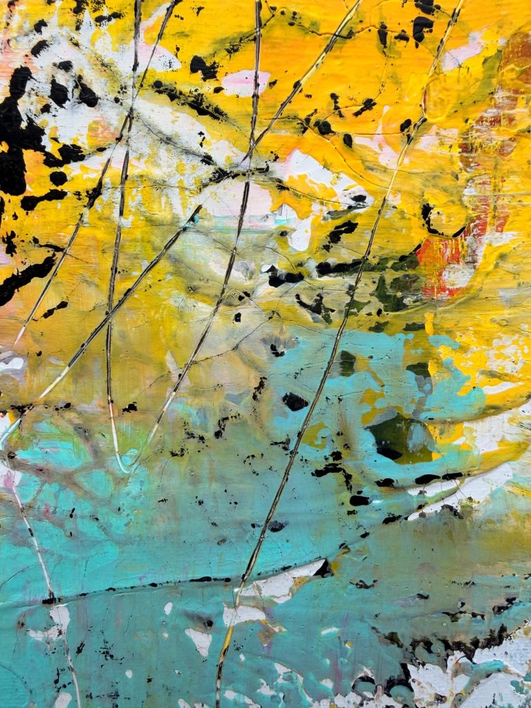 In meiner Arbeit spiele ich bewusst mit Gegensätzen – zwischen Ruhe und Bewegung, Leichtigkeit und Struktur. Die Farben wirken zunächst frei und ungeordnet, verbinden sich jedoch zu einem harmonischen Gesamtbild mit klarer Präsenz. Die unterschiedlichen Schichten, Kratzspuren und Farbübergänge erzeugen eine spürbare Dynamik, die sich beim längeren Betrachten immer weiter entfaltet.